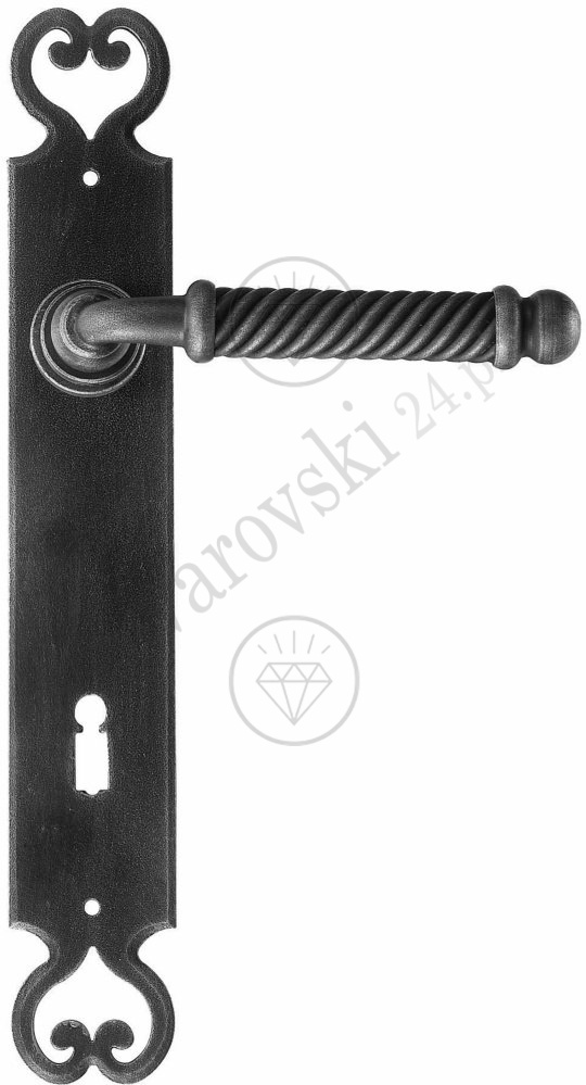 Klamka Mardid na szyldzie długim z otworem na klucz wykonana jest z ręcznie kutego żelaza i dostępna w trzynastu powłokach kolorystycznych. Okucie znajduje zastosowanie do drzwi wewnętrznych. Rozstaw 90 mm.