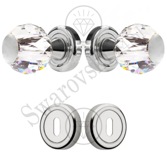 Komplet gałek obrotowych wykonanych z mosiądzu chromowanego oraz kryształu Swarovskiego o średnicy 50 mm. Przeznaczenie: do drzwi wewnętrznych. Sposób montażu: na śruby przelotowe i wkręty do drewna. Typ działania: gałka wspomagana sprężyną.