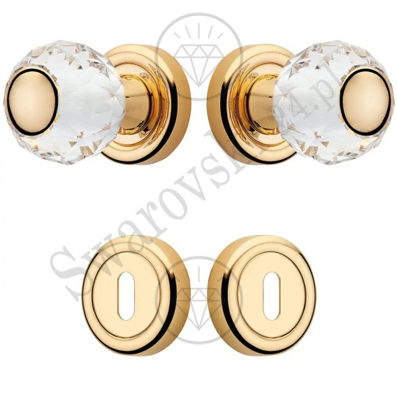 Komplet gałek obrotowych wykonanych z mosiądzu pozłacanego oraz kryształu Swarovskiego o średnicy 50 mm. Przeznaczenie: do drzwi wewnętrznych. Sposób montażu: na śruby przelotowe i wkręty do drewna. Typ działania: gałka wspomagana sprężyną.